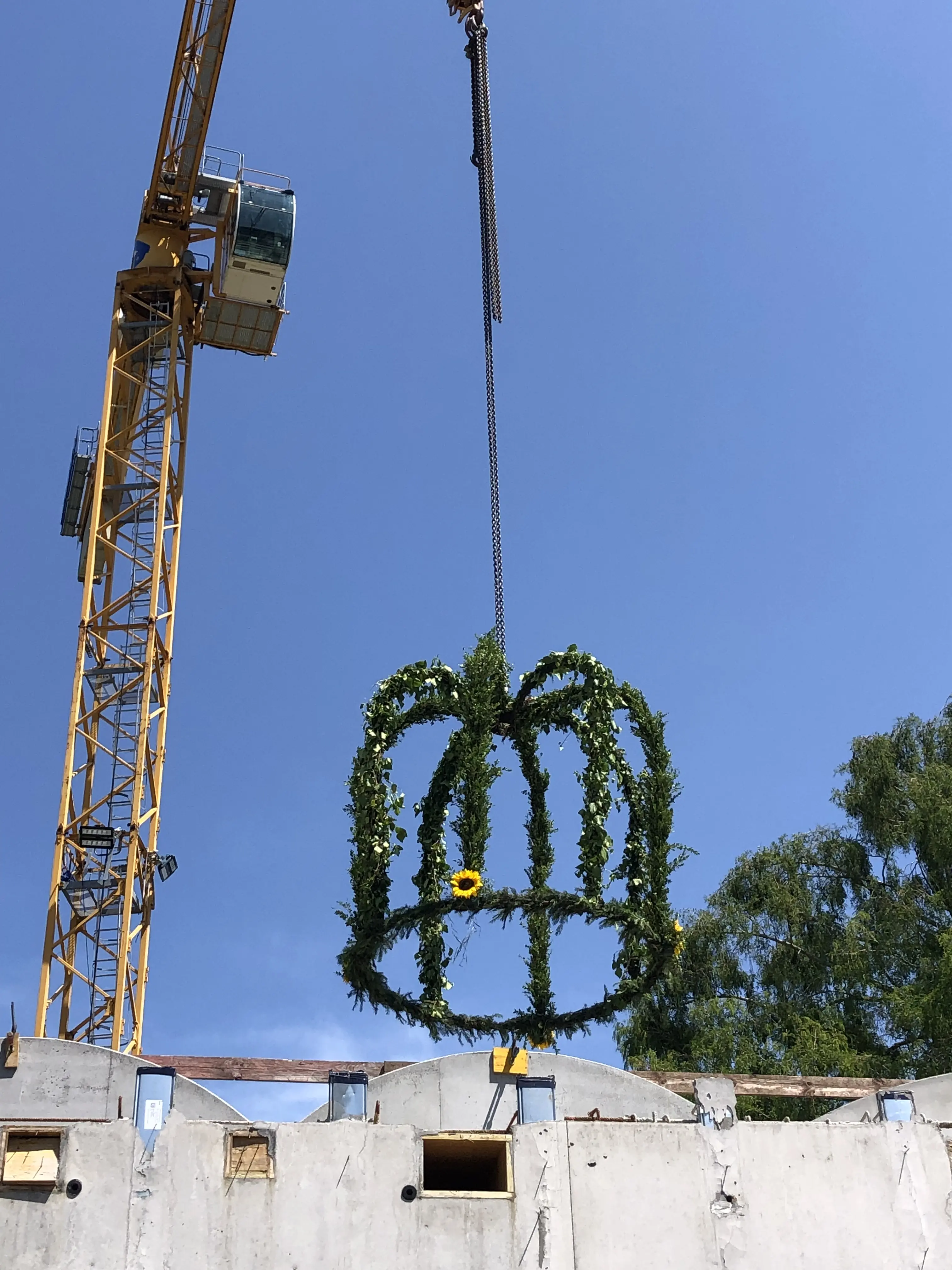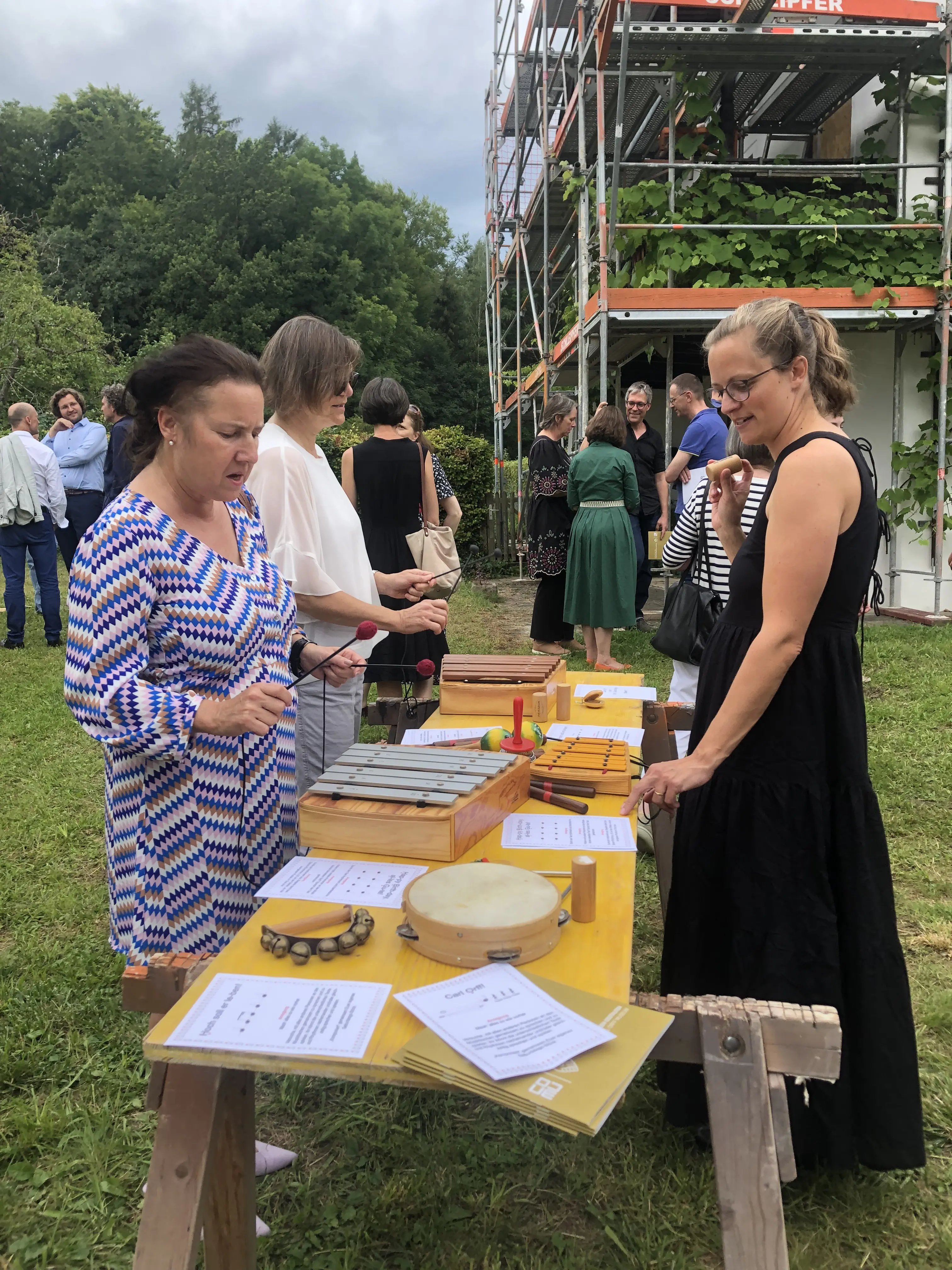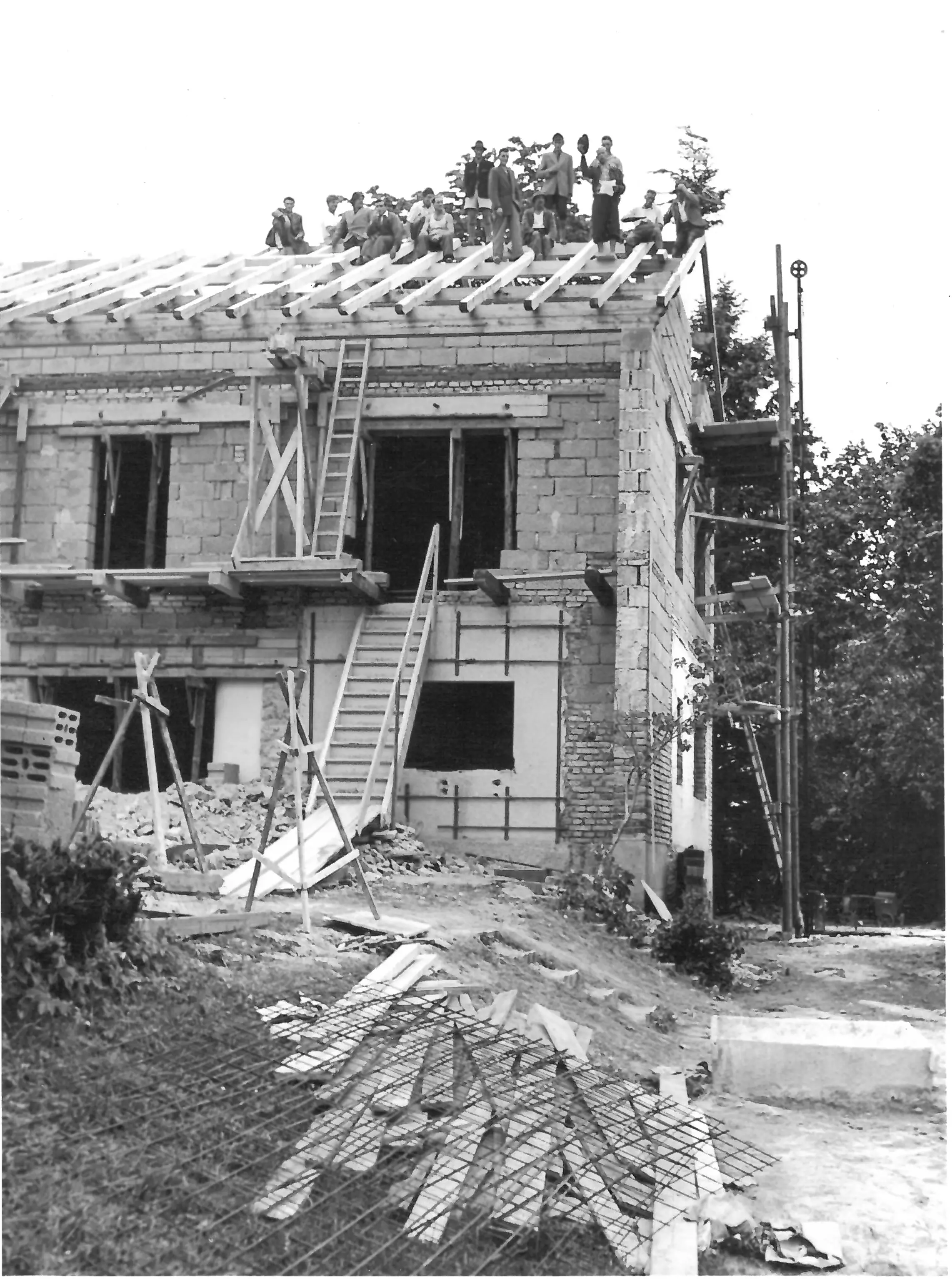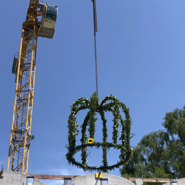A roof for its birthday. The Carl Orff Foundation celebrates 10 July 2024 with a topping-out ceremony. In June, the time had finally come: the new building of the COMU Carl Orff Museum at Ziegelstadel 1 in Dießen got a new roof. Construction workers used two cranes to lift 11 tonnes of vaulted ceiling onto the large exhibition hall. Almost 70 years after Carl Orff himself celebrated the extension of his house at Ziegelstadel 1, another topping-out ceremony took place. Pupils from the Carl Orff School in Dießen opened the celebration with songs. Secretary General Judith Janowski then welcomed those present and expressed her particular thanks to all the sponsors who have generously supported the museum. Last but not least, site manager Torsten Huhle from the contractor Lutzenberger, foreman Christoph Meyer and concrete expert Lukas Schröther gave the topping-out speech and emptied their glasses three times to the applause of the guests: ‘May the museum be a place of knowledge, wonder and inspiration, where history comes alive and knowledge flourishes.’ Following the ceremony, celebrations took place in the courtyard of the Orff estate. Guests were able to enjoy food and drink. At an improvised table with instruments and playing cards, they had the opportunity to test a hands-on station of the future museum for the first time and sing a birthday song to Carl Orff. Fotos: Michael Tschuschner und COMU | COS Richtfest 1955 Bauarbeiter stehen auf dem Dachstuhl, am Giebel ist ein geschmücktes Bäumchen © COS Carl Orff auf dem Dachstuhl Carl Orff steht im Anzug auf dem Dachstuhl seines Hauses. © COS Das Museum bekommt ein Tonnendach Mit dem Kran wird ein Tonnenteil in ein modernes Gebäude eingesetzt. © COS Der erste Schritt fürs Dach ist gemacht! Alle Betonteile sind verbaut Ein modernes Betongebäude mit mehreren halbmondförmigen Kuppeln am Giebel. © COS Die Richtkrone An einem Baukran hängt eine große grünumwundene Krone. © COS Kinder singen ein Ständchen zum Richtfest Kinder singen und spielen auf Xylosphonen. © Foto: Michael Tschuschner Die Bauleute sprechen den Richtspruch Über den Rand eines Betongebäudes im Rohbau ragen drei Köpfe mit Helmen. © Foto: Michael Tschuschner Buffet fürs Richtfest Auf einem Buffet stehen Platten mit Essen und Blumendeko und Tellerstapel. © COS Ein Geburtstagsständchen für Carl Orff Frauen stehen an einem Tisch mit vielen Instrumenten und machen Musik. © COS Artikel in News • 19. Jul 2024 Teilen Twitter Facebook LinkedIn